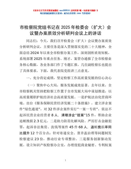 / 市检察院党组书记在2025年检委会(扩大)会议暨办案质效分析研判会议上的讲话