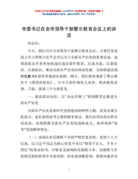 / 市委书记在全市领导干部警示教育会议上的讲话