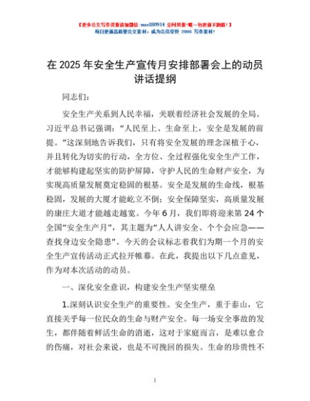 / 在2025年安全生产宣传月安排部署会上的动员讲话提纲