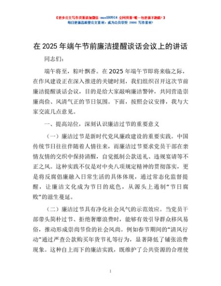 / 在2025年端午节前廉洁提醒谈话会议上的讲话