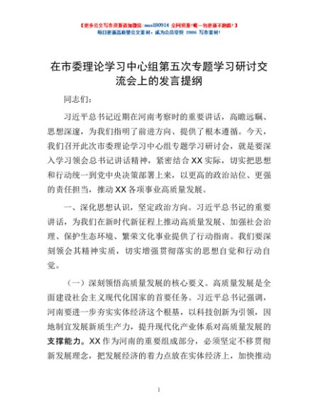 / 在市委理论学习中心组第五次专题学习研讨交流会上的发言提纲