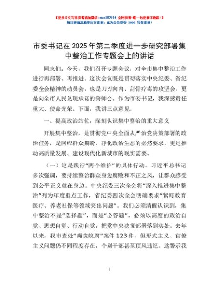 / 市委书记在2025年第二季度进一步研究部署集中整治工作专题会上的讲话