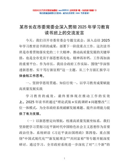 / 某市长在市委常委会深入贯彻2025年学习教育读书班上的交流发言