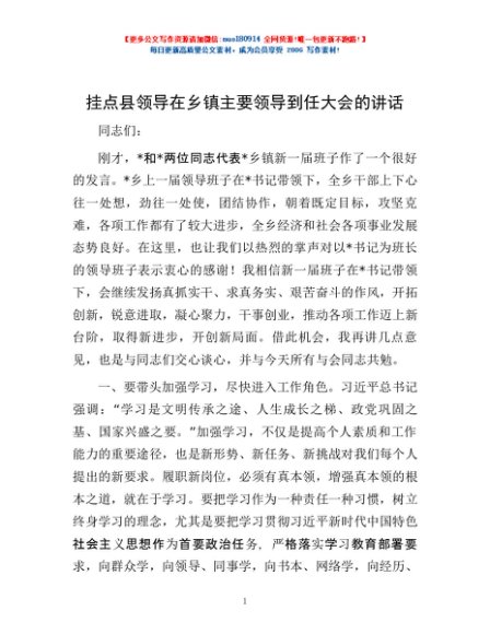 / 挂点县领导在乡镇主要领导到任大会的讲话