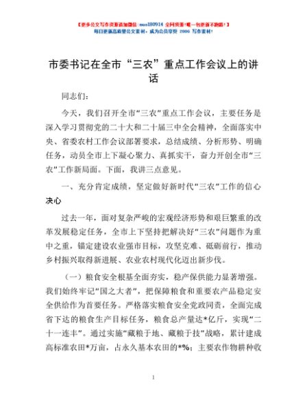/ 市委书记在全市“三农”重点工作会议上的讲话