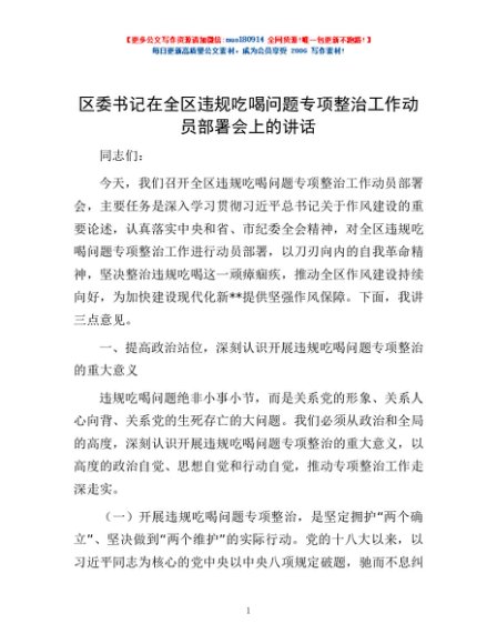 / 区委书记在全区违规吃喝问题专项整治工作动员部署会上的讲话