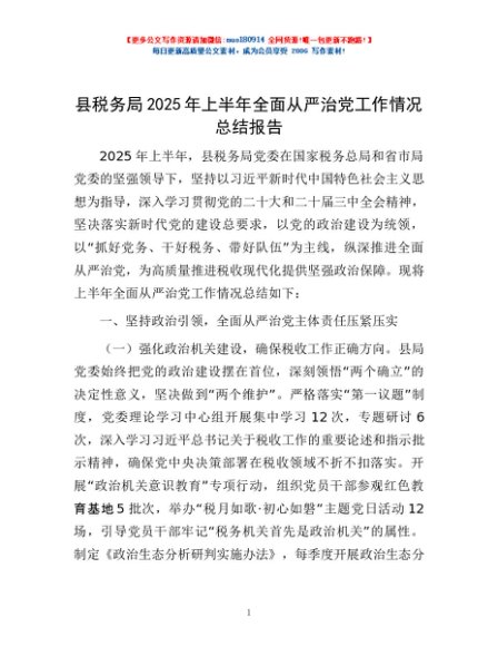 / 县税务局2025年上半年全面从严治党工作情况总结报告