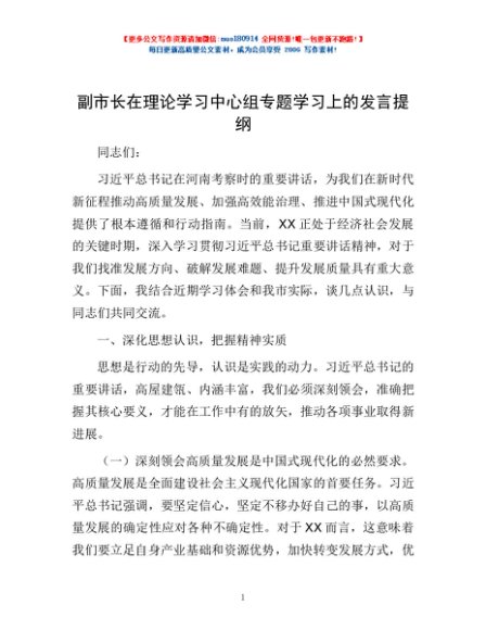 / 副市长在理论学习中心组专题学习上的发言提纲