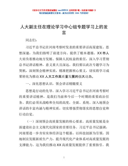 / 人大副主任在理论学习中心组专题学习上的发言