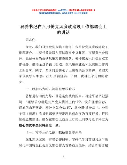 / 县委书记在六月份党风廉政建设工作部署会上的讲话