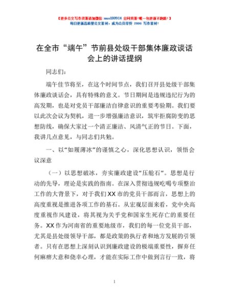 / 在全市“端午”节前县处级干部集体廉政谈话会上的讲话提纲