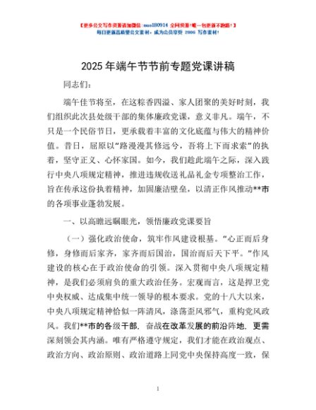 / 2025年端午节节前专题党课讲稿