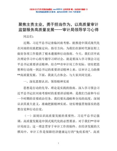 / 聚焦主责主业,勇于担当作为,以高质量审计监督服务高质量发展——审计局领导学习心得
