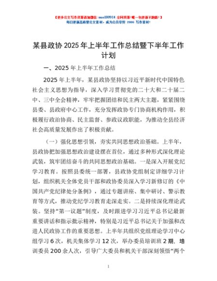 / 某县政协2025年上半年工作总结暨下半年工作计划
