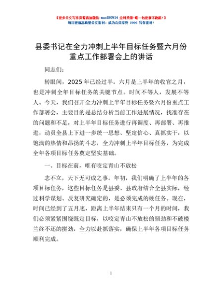 / 县委书记在全力冲刺上半年目标任务暨六月份重点工作部署会上的讲话