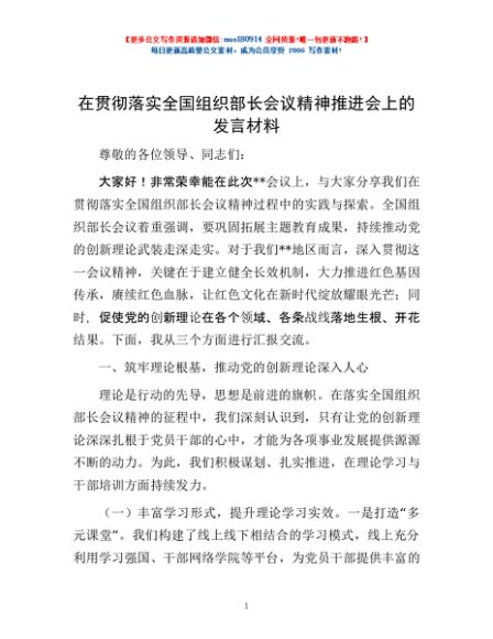 / 在贯彻落实全国组织部长会议精神推进会上的发言材料