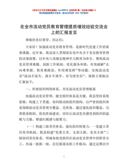 / 在全市流动党员教育管理提质增效经验交流会上的汇报发言