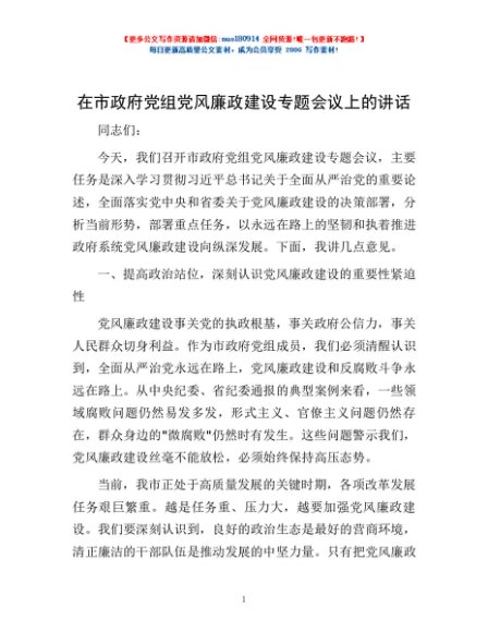 / 在市政府党组党风廉政建设专题会议上的讲话