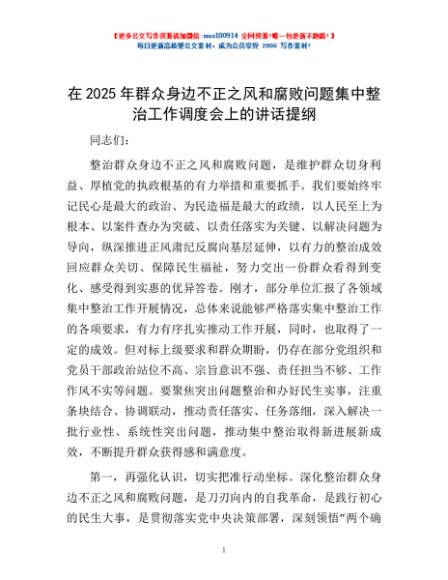 / 在2025年群众身边不正之风和腐败问题集中整治工作调度会上的讲话提纲