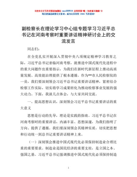 / 副检察长在理论学习中心组专题学习习近平总书记在河南考察时重要讲话精神研讨会上的交流发言
