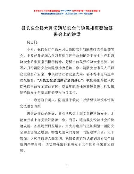 / 县长在全县六月份消防安全与隐患排查整治部署会上的讲话