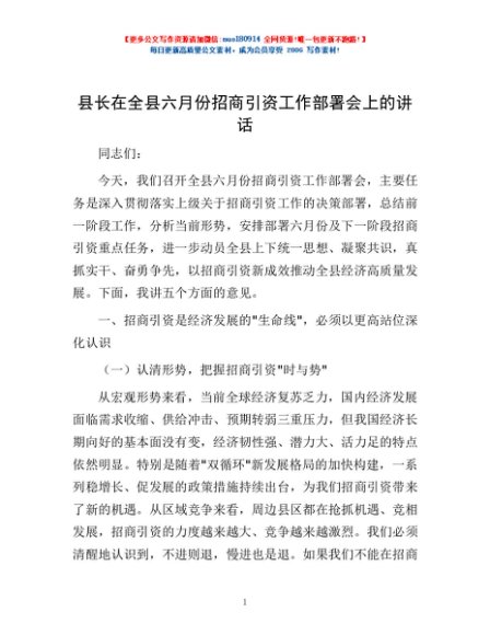 / 县长在全县六月份招商引资工作部署会上的讲话