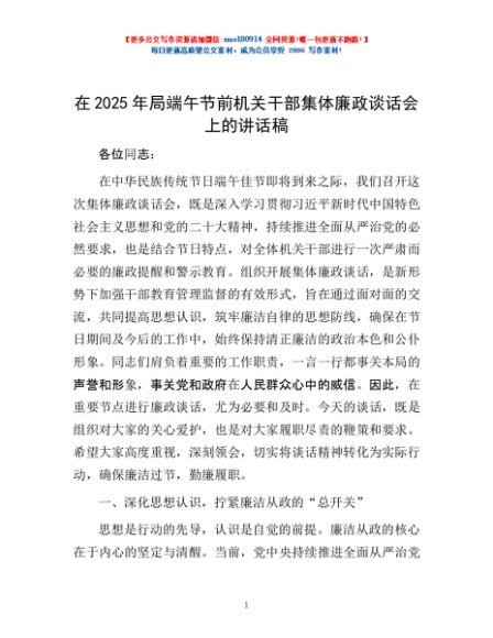 / 在2025年局端午节前机关干部集体廉政谈话会上的讲话稿