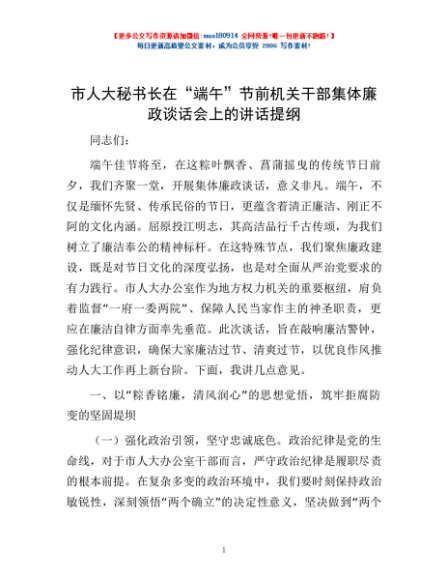 / 市人大秘书长在“端午”节前机关干部集体廉政谈话会上的讲话提纲