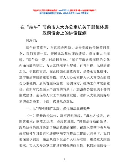 / 在“端午”节前市人大办公室机关干部集体廉政谈话会上的讲话提纲