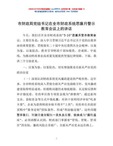 / 市财政局党组书记在全市财政系统思廉月警示教育会议上的讲话