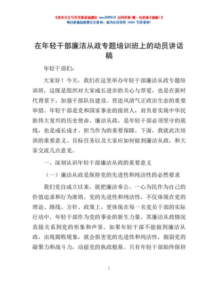 / 在年轻干部廉洁从政专题培训班上的动员讲话稿