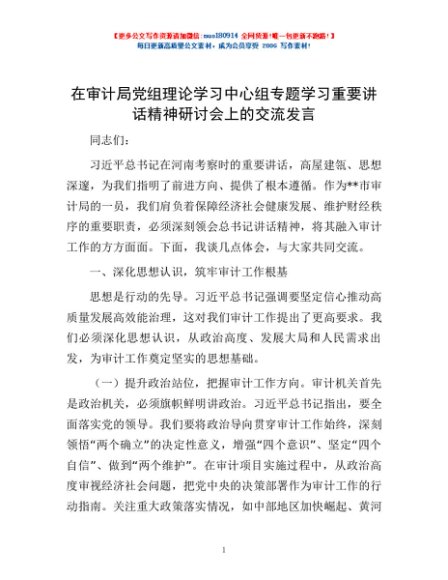 / 在审计局党组理论学习中心组专题学习重要讲话精神研讨会上的交流发言