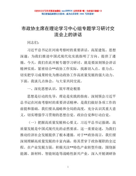 / 市政协主席在理论学习中心组专题学习研讨交流会上的讲话