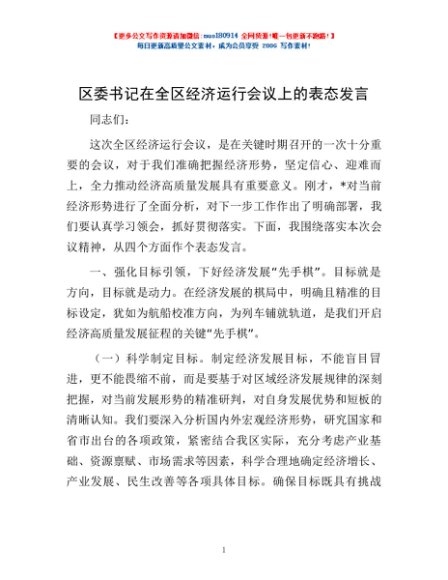 / 区委书记在全区经济运行会议上的表态发言