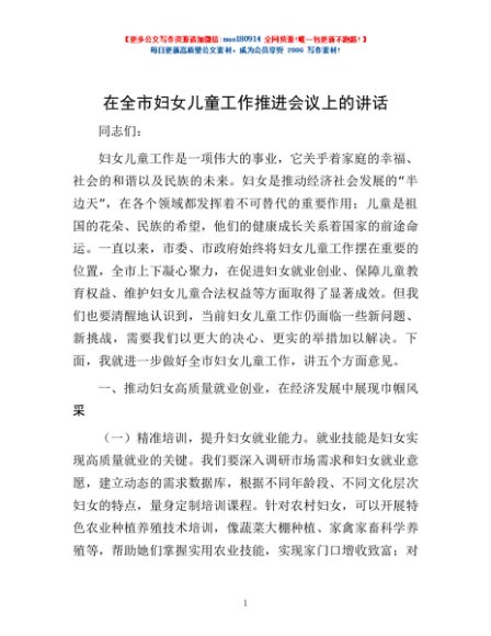 / 在全市妇女儿童工作推进会议上的讲话