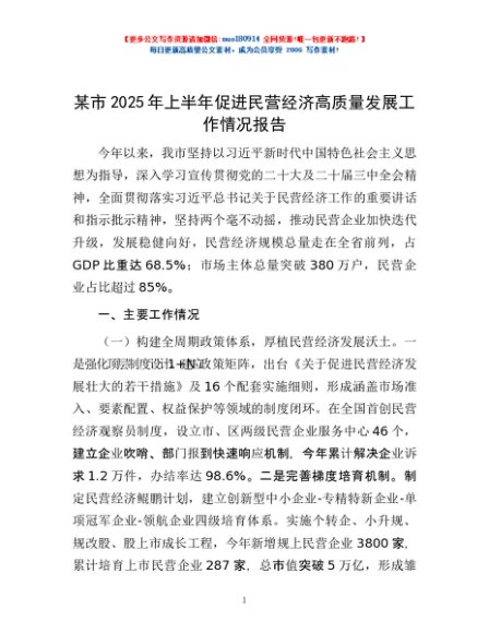 / 某市2025年上半年促进民营经济高质量发展工作情况报告