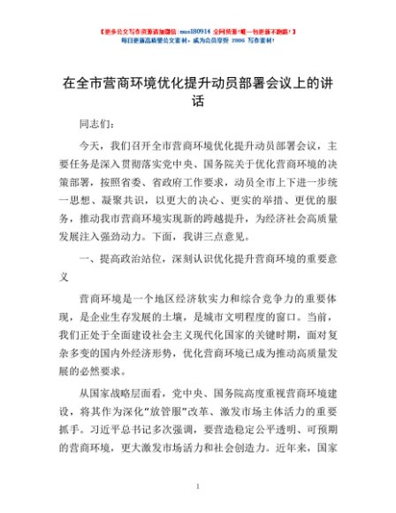 / 在全市营商环境优化提升动员部署会议上的讲话