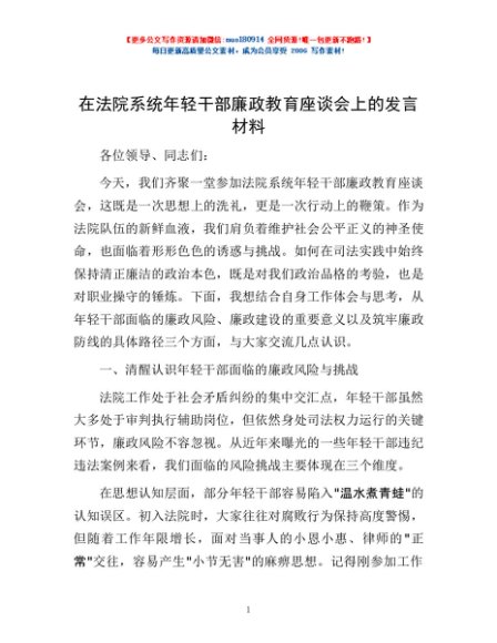 / 在法院系统年轻干部廉政教育座谈会上的发言材料