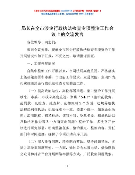 / 局长在全市涉企行政执法检查专项整治工作会议上的交流发言