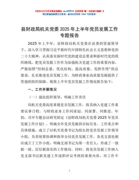 / 县财政局机关党委 2025 年上半年党员发展工作专题报告