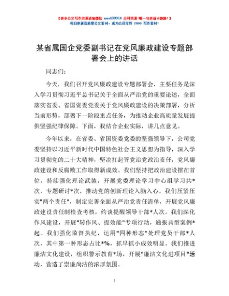 / 某省属国企党委副书记在党风廉政建设专题部署会上的讲话