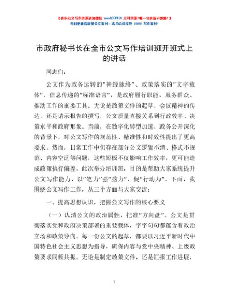/ 市政府秘书长在全市公文写作培训班开班式上的讲话