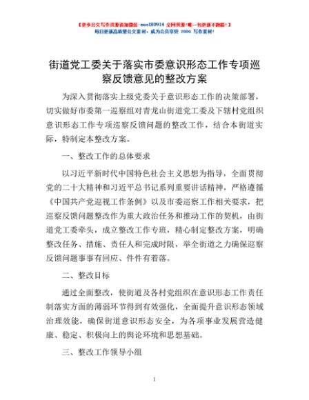 / 街道党工委关于落实市委意识形态工作专项巡察反馈意见的整改方案