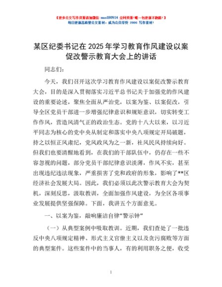 / 某区纪委书记在2025年学习教育作风建设以案促改警示教育大会上的讲话