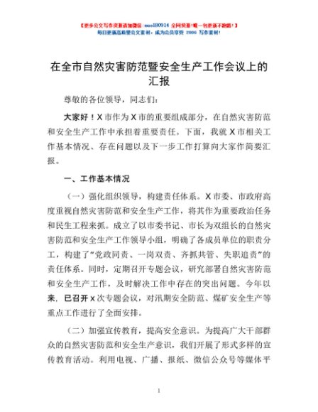 / 在全市自然灾害防范暨安全生产工作会议上的汇报