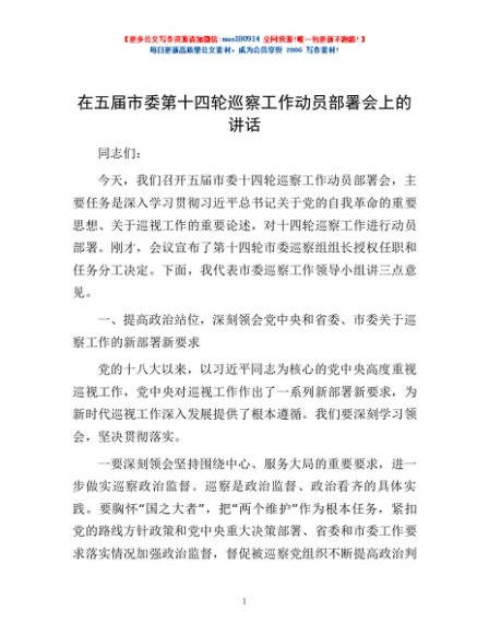 / 在五届市委第十四轮巡察工作动员部署会上的讲话