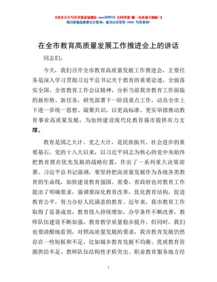 / 在全市教育高质量发展工作推进会上的讲话