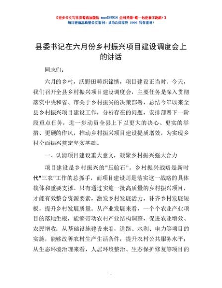 / 县委书记在六月份乡村振兴项目建设调度会上的讲话