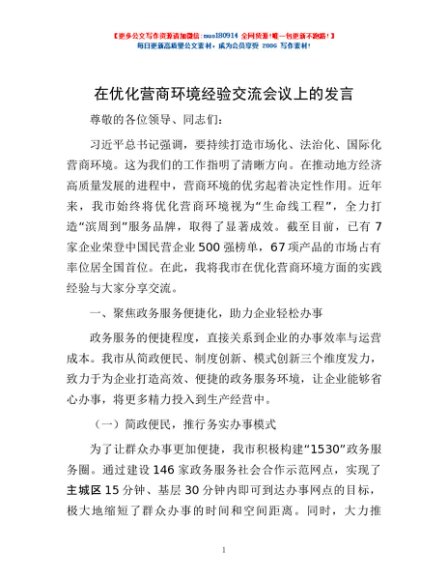 / 在优化营商环境经验交流会议上的发言