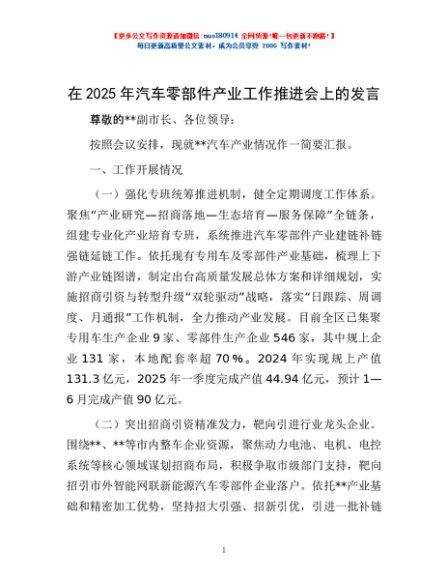 / 在2025年汽车零部件产业工作推进会上的发言